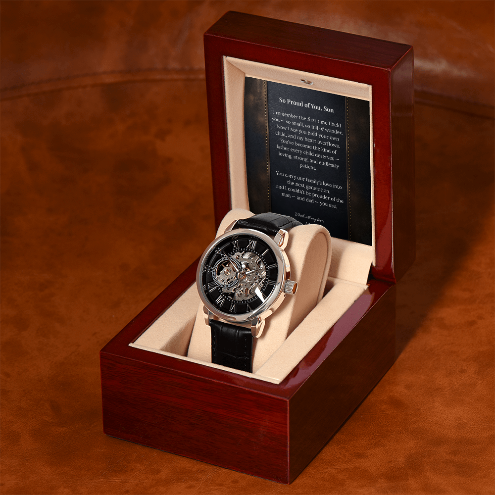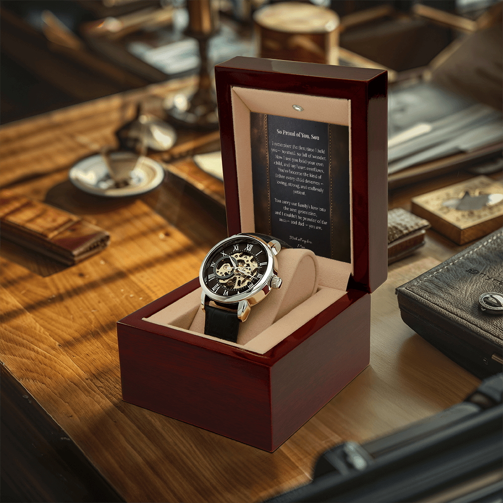 The Forever Proud Watch blends classic design with modern elegance. Featuring a genuine leather strap, durable hardened mineral glass, and a skeleton dial that reveals its intricate inner workings—this automatic timepiece runs on motion, not batteries. Just like your love, it keeps going without ever needing a recharge.